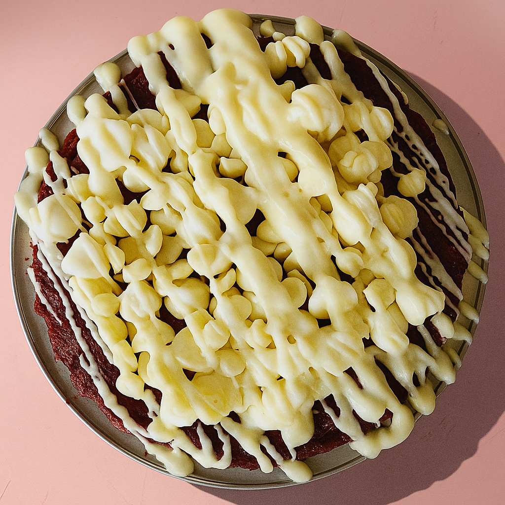 This Red velvet skillet cookies features a decadent filling of hazelnut chocolate and cream cheese frosting, complemented by white chocolate chips and cream cheese drizzle.