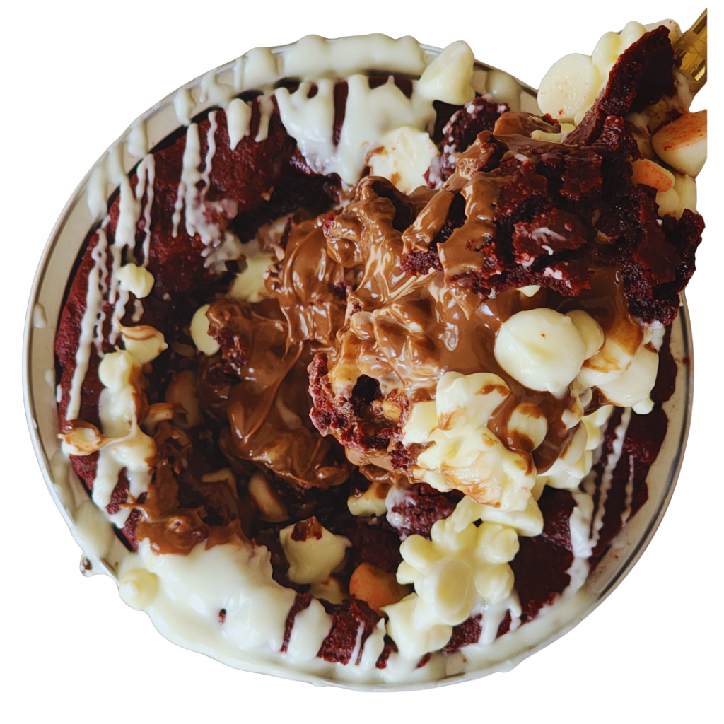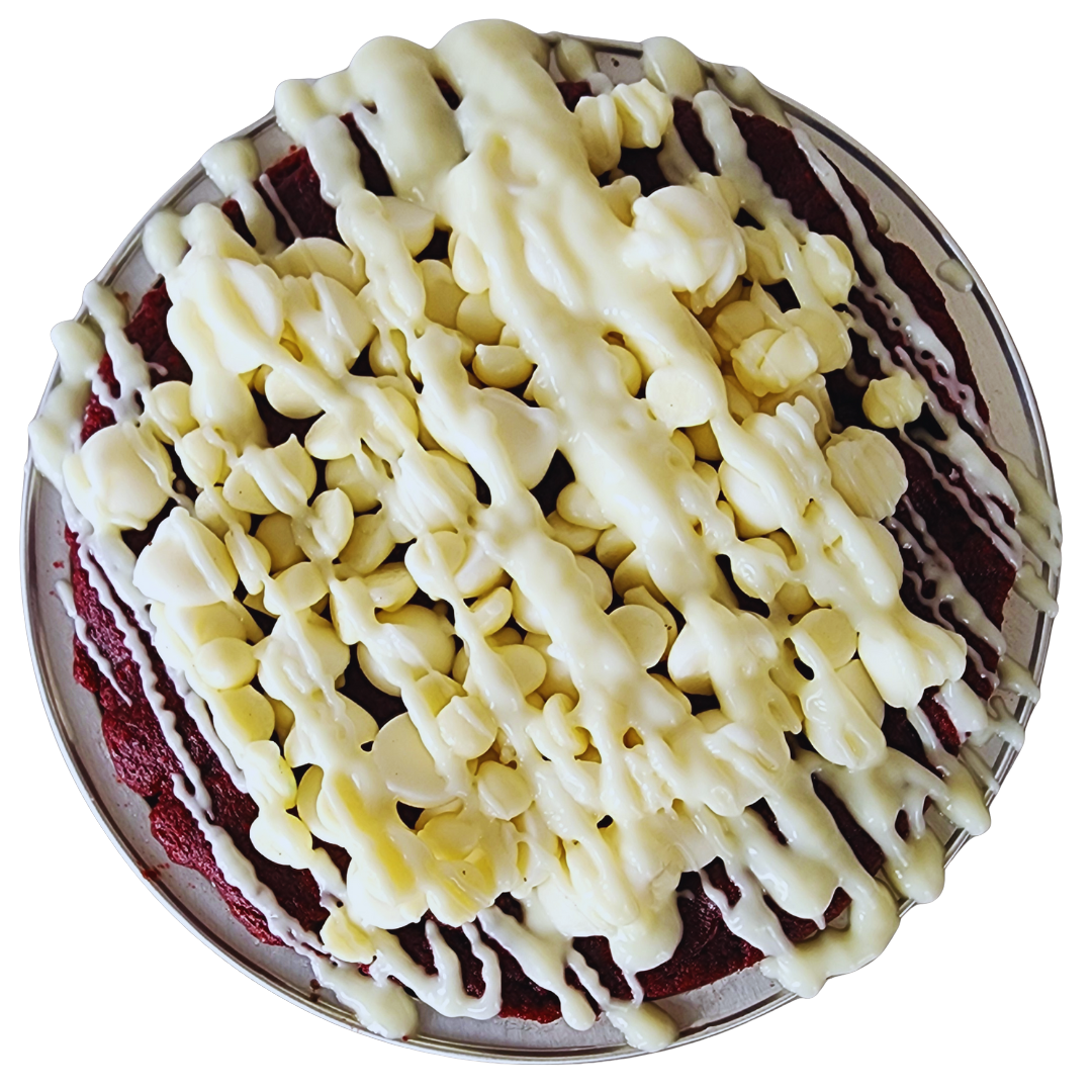 This Red velvet skillet cookies features a decadent filling of hazelnut chocolate and cream cheese frosting, complemented by white chocolate chips and cream cheese drizzle.